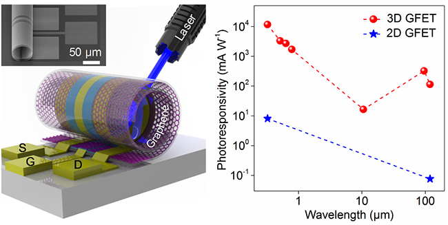 该研究提出了一种利用氮化硅应力层驱动2D GFET自卷曲为微管式3D GFET结构的方法,首次制造出了卷曲层数(1-5)和半径(30 μm-65 μm)精确可控的3D GFET器件阵列。这种3D GFET可用作光电传感器,工作波长范围从紫外光(325 nm)区域一直延伸至太赫兹(119 μm)区域,为已经报道的基于石墨烯材料的光电传感器带宽之最。同时,这种3D GFET兼具超高的响应度和超快的响应速度,在紫外光至可见光区域的响应度可达1 A/W以上,在太赫兹区域的响应度高达0.23 A/W,响应时间快至265 ns(纳秒)。该研究所提出的制造方法不仅为3D石墨烯光电器件与系统的实现铺平了道路,还可以推广至二硫化钼、黑磷等其他类石墨烯2D晶体材料。审稿人高度评价该研究成果,认为该研究对整个二维材料研究领域具有重要意义。
