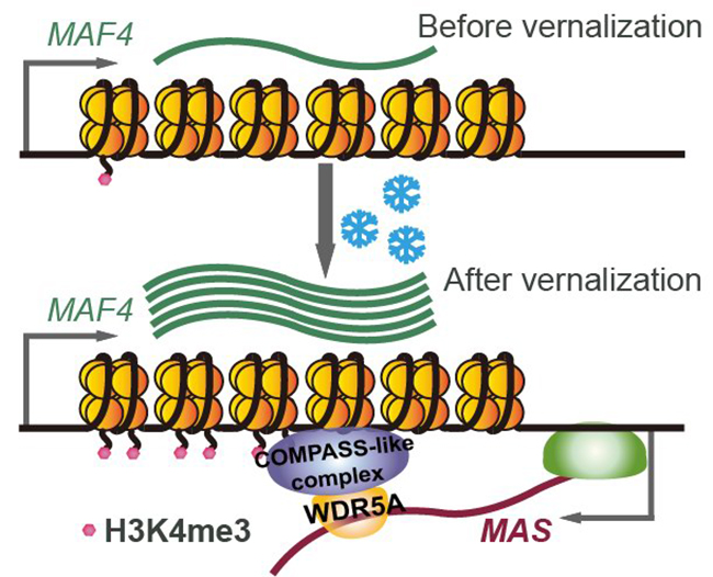 为了研究植物中lncRNA对基因表达的调控功能,戚益军研究组利用链特异性RNA-seq结合生物信息学分析方法,系统鉴定和分析了模式植物拟南芥中的lncRNA。该研究共鉴定到了6510个lncRNA,其中包括4050个NAT-lncRNA以及2460个lincRNA。研究发现,在不同组织或逆境处理条件下,大量NAT-lncRNA与邻近蛋白编码基因的表达呈现正相关趋势。此外,通过人工miRNA的技术,沉默部分NAT-lncRNA的表达,可导致邻近蛋白编码基因表达下降,表明NAT-lncRNA可正向调控邻近基因的表达。该研究为解读植物中lncRNA的功能和作用机制提供了丰富的资源和良好的基础;MAS正向调控MAF4转录的机制解析对研究植物中大量NAT-lncRNA的功能机制有重要的借鉴意义。