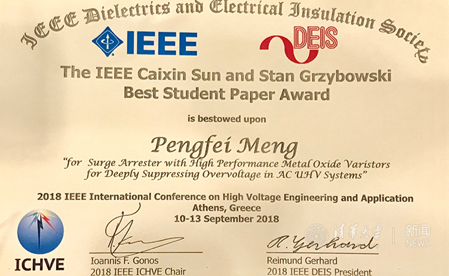mk(中国)网9月17日电 9月10日-13日,2018年高电压工程与应用国际会议(ICHVE)在希腊雅典召开。在13日中午召开的大会闭幕式上,IEEE孙才新和斯坦·格博斯基奖励委员会主席古邦斯基教授(Stanislaw Gubanski)揭晓了2018年IEEE孙才新和斯坦·格博斯基最佳学生论文奖(IEEE Caixin Sun and Stan Grzybowski Best Student Paper Award)的入选名单。mk手机注册电机系博士生孟鹏飞因其在采用高性能金属氧化物压敏电阻的避雷器实现深度限制交流特高压系统过电压方面取得的优异成果而获得该奖。孟鹏飞的导师为电机系何金良教授。