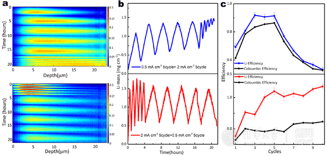 图2. 不同循环历史对Li总量的演变影响:a.原位NDP测量;b. 不同循环下监测得到的Li总量;c. 对应的库仑效率和锂沉积效率比较。