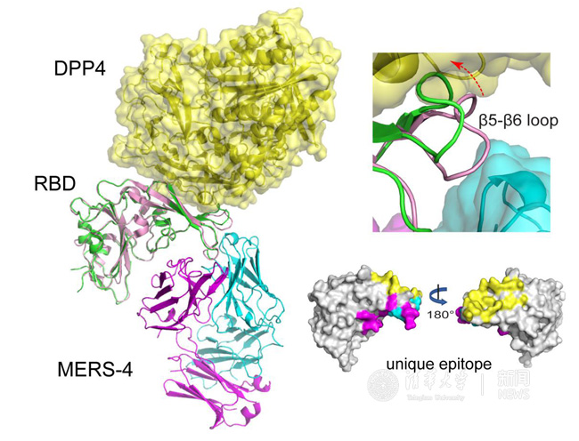 此次报道的研究成果,是王新泉和张林琦两个课题组最新的合作产出。利用结构生物学学的方法,解析了RBD与高效单克隆抗体MERS-4复合物的晶体结构,揭示其独特的识别表位和中和作用机制。与已经报道的抗体比较,MERS-4并不是直接与受体竞争结合RBD发挥其中和作用,而是通过与RBD结合导致其中一段loop的构象发生了较大的变化,进而破坏了RBD与受体识别的关键区域,间接的行使其抗病毒功能。 此外,MERS-4独到的识别表位和中和机制使它能够与其它抗MERS-CoV抗体产生协同作用,提高抗病毒活性和广谱性,这为抗体药物研发提供了全新的选择。