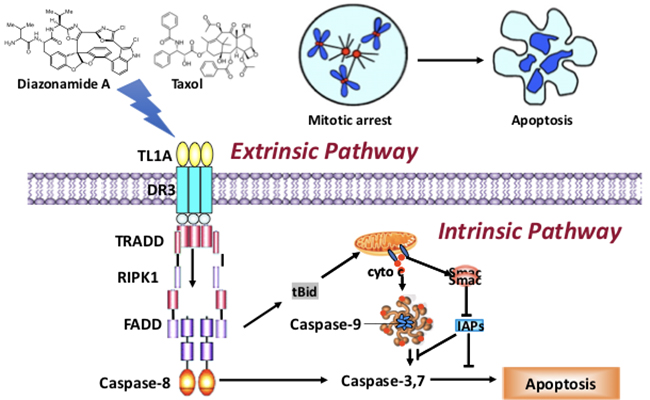 课题组利用一种特异性抑制细胞有丝分裂的海洋天然产物二氮嗪A (diazonamide A)为主要研究工具,其抗癌活性与紫杉醇和长春碱相当,对正常细胞毒的副作用却大为降低,是一类很有开发前景的新型抗癌药物。研究发现这类药物诱导的细胞凋亡都需要死亡受体3 (DR3)。“有丝分裂灾难”诱导死亡受体3的配体TL1A依赖于溶酶体分泌。TL1A与死亡受体3的结合刺激包含相关死亡结构域蛋白 (FADD)和半胱氨酸蛋白酶8 (caspase-8)的死亡诱导信号复合物(DISC)的形成,从而促使激活表达死亡受体3的细胞凋亡。