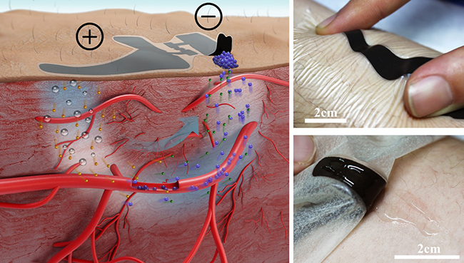 冯雪课题组发展了基于力学-化学耦合原理的电化学双通道无创血糖测量方法,利用可以与人体自然共型贴附的柔性电子器件,对皮肤表面施加不会引起皮肤不良反应的电场,通过离子导入的方式改变组织液渗透压,调控血液与组织液渗透和重吸收平衡关系,驱使血管中的葡萄糖按照设计路径主动、定向地渗流到皮肤表面,继而通过只有3.8微米厚的超薄柔性生物传感器件进行高精度测量。