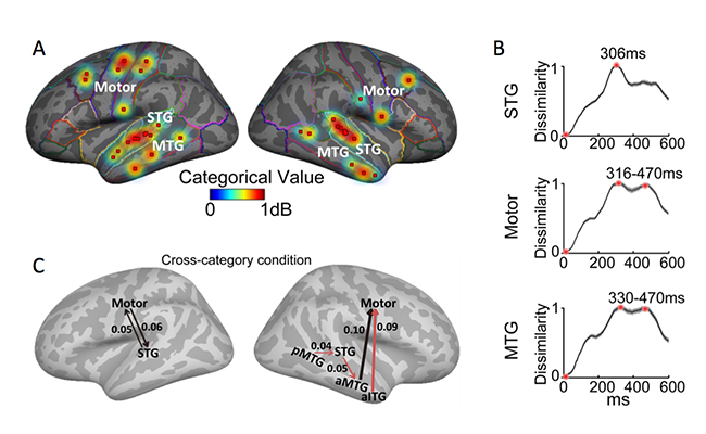 除了传统的听觉和语言处理脑区之外,该研究发现运动相关脑区也参与了声调的类别化处理,而且运动相关脑区和听觉语言脑区之间存在精细的响应时序关系和因果性的信息传递。这一发现提示,大脑语音处理可能需要听觉和运动模态的协同,为神经语言学中久有争议的“语言感知的运动理论”提供了新的证据。