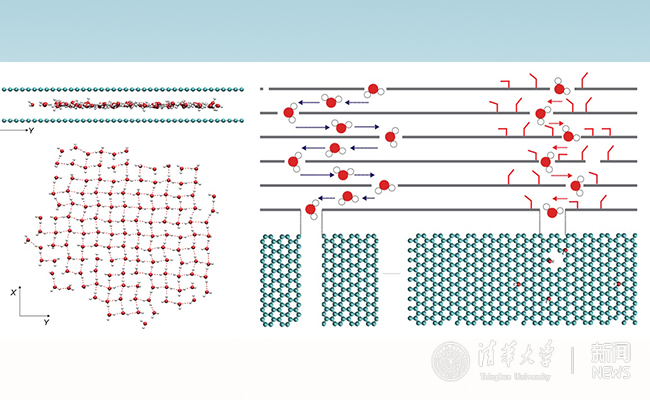 图1 左:石墨烯层间水团簇的有序结构;右:氧化石墨烯跨膜水扩散行为示意。