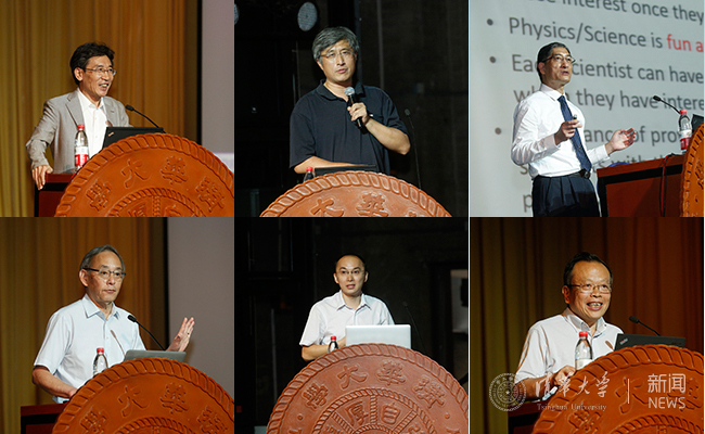 薛其坤(左上)、高原宁(中上)、张绵福(右上)、朱棣文(左下)、冯骅(中下)、朱邦芬(右下)分别作报告。
