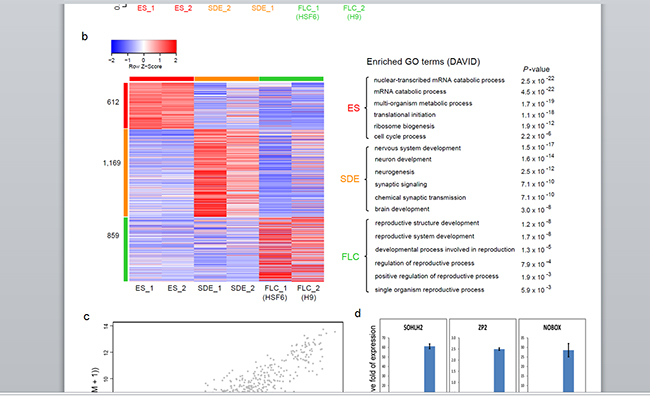 图2:转录组分析(RNA-seq)显示人类卵泡样细胞(FLC)表达多个生殖细胞基因。