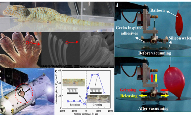 (a) 壁虎及脚掌刚毛;(b)航天器外表巡查机器人概念图(红色圆圈内);(c)真空下仿生表面黏附力随剪切的变化;(d)用气球展示真空环境的黏附表面夹持器晶元转移。