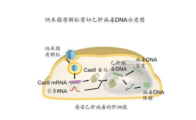纳米脂质颗粒能有效的把Cas9 mRNA和针对乙肝病毒DNA的引导RNA输送到动物的肝细胞内。Cas mRNA随后被翻译成 Cas9蛋白,蛋白与引导RNA结合后特异性的识别乙肝病毒DNA并对其进行剪切,导致病毒DNA突变或者降解,从而从源头上降低病毒的水平。