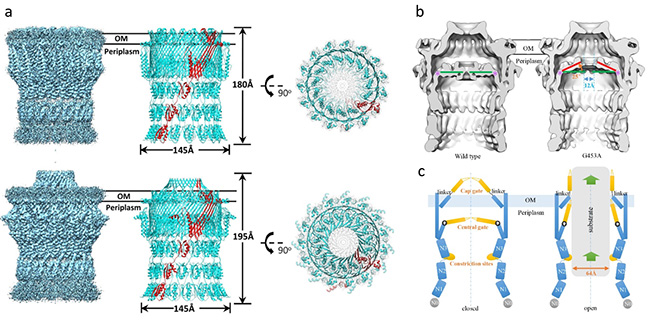 图为分泌素GspD蛋白的冷冻电镜结构和通道开关的分子机制。(a)GspD复合物的电子密度图和原子模型图。上半部分为大肠杆菌(Escherichia coli)来源的GspD,下半部分为霍乱弧菌(Vibrio cholerae)来源的GspD,右半部分为电子密度图和原子模型叠加在一起的顶视图。(b)半开放状态的结构与野生型的对比剖面图。电子密度图低通滤波到7埃。(c)基于得到的结构和生化验证提出的通道开放分子模型图。黑色圆圈表示中间门控起转折的关键甘氨酸。