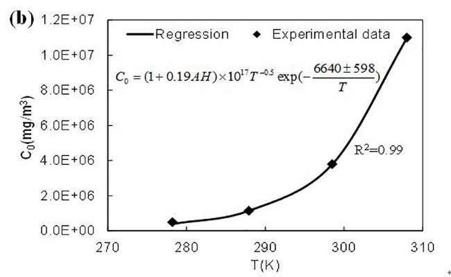 (b)图为甲醛初始可散发浓度与温度和绝对湿度(AH)的综合关系式。