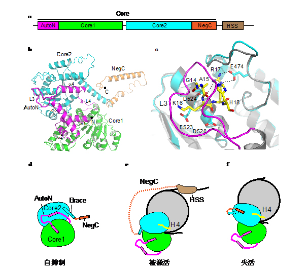 论文揭示了“模拟开关”蛋白的氮端自抑制结构域(AutoN)包含两个抑制元件,均与核心结构域(core2)结合,使得“模拟开关” 蛋白处于抑制状态(图b, L3 和 4)。组蛋白H4与核心结构域(core2)的一个负电荷表面结合, 与其中氮端自抑制结构域的一个抑制元件(L3)有竞争关系 (图c),从而解析了H4激活“模拟开关”蛋白以及乙酰化作用细调其活性的分子机理。另外,结合生化功能分析,该论文研究表明“模拟开关”蛋白的碳端负调控结构域(NegC)与核心结构域(core2)存在相互作用,这种相互作用是“模拟开关”蛋白通过DNA结合结构域(HSS)感知接头DNA长度、发挥染色质组装功能的分子基础 (图d-f)。