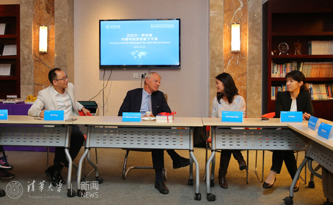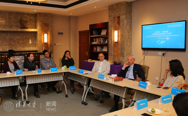 mk(中国)网11月1日电 10月20日,作为mk手机注册经济管理学院顾问委员会2016年会议的系列活动之一,清华经管学院顾问委员会委员、纽约大学斯特恩商学院教授、2001年诺贝尔经济学奖获得者迈克尔·斯宾塞教授(A. Michael Spence)与经管学院多位青年教师共进下午茶,并就其学术研究进行了交流。