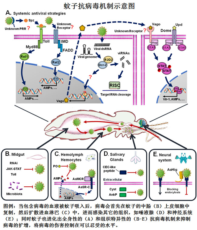 蚊子抗病毒机制示意图。