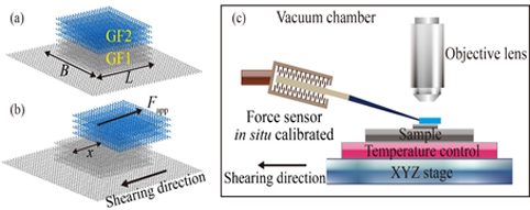 c图:利用原位校准的力传感器测量片层相对运动时的剪切力,同时控制实验环境温度和真空度。