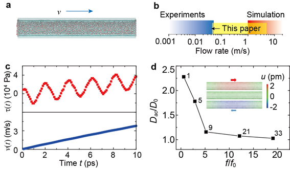 (a)水在碳纳米管内流动的示意图;(b)本研究之前的实验、理论和本研究的研究范围。(c)流动阻力和流速之间的震荡关系;(d)由水与碳纳米管中声子耦合引起的扩散速度的提高。