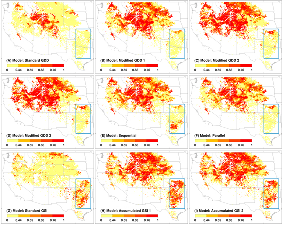 图一. 不同物候模型在美国西部草原地区的时空结果表现。