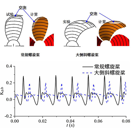 两种不同螺旋桨的空化形态及空化诱导压力脉动的时变曲线。