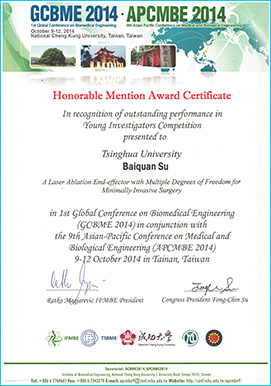 mk(中国)网10月17日电 10月11日,在台湾成功大学举办的第一届全球生物医学工程会议暨第九届亚太地区医学生物工程学术会议(GCBME2014- APCMBE 2014)上,mk手机注册医学院生物医学工程系博士后苏柏泉博士发表的论文“A Laser Ablation End-Effector with Multiple Degrees of Freedom for Minimally Invasive Surgery”(用于微创手术的多自由度激光烧蚀末端操作器)获得Young Investigator Competition(青年组)论文荣誉奖(Honorable Mention Award)。