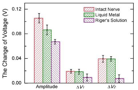 在此项题为Liquid Metal as Connecting or Functional Recovery Channel for the Transected Sciatic Nerve(液态金属作为连接或恢复切断坐骨神经功能的通道)(Jie Zhang, et al., arXiv:1404.5931)的论文中,研究小组首次证实了以液态金属作为高传导性神经信号通路的可行性。通过建立牛蛙腓肠肌模型,采用液态金属连接剪断的神经组织,借助微弱电刺激试验探明了液态金属神经传导的优势。结果表明,利用液态金属连接的神经模型能很好的传递刺激信号,与剪断前的正常神经组织在信号传导方面具有高度的一致性和保真度,显著优于传统的林格氏液。与此同时,由于液态金属在X射线下具有很强的显影性,因而在完成神经修复之后很容易通过注射器取出体外,从而避免了复杂的二次手术。这一方法为神经连接与修复开辟了全新方向。国际上诸多科学媒体纷纷对此加以评介,认为是令人震惊的医学突破(Most Amazing Medical Breakthroughs)。
