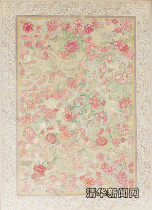 李世铃作品《梦还花窗》的构图选用了苏州园林三副极具特色的花窗为骨架,一簇簇鲜花围绕,再穿插一些鸟和古画中借鉴的建筑来营造梦境的氛围,色彩丰富但不抢眼,作为地毯放置在室内空间里,符合内敛温柔的设定。