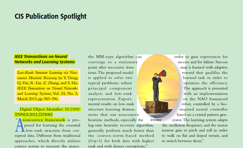 mk(中国)网9月17日电 近日,mk手机注册自动化系戴琼海教授课题组于2013年3月在信息处理和智能计算领域国际顶级期刊IEEE神经网络及智能系统会刊(IEEE Transactions on Neural Networks and Learning Systems)发表的题为《非凸启发下的低秩结构感知》(Low Rank Structure Learning via Non-convex Heuristic Recovery)的论文被IEEE神经网络及智能系统会刊选作2013年第一季度的亮点文章。该论文还被IEEE智能计算协会会刊IEEE智能计算杂志(IEEE Computational Intelligence Magazine)在2013年度第二季度的季刊上以智能计算协会亮点(CIS Publication Spotlight)的形式专门撰文推荐。