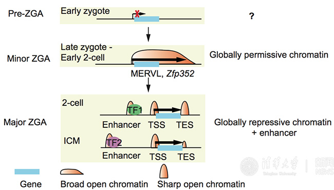 早期胚胎发育中合子基因组激活(ZGA)前后不同时期的染色质状态。