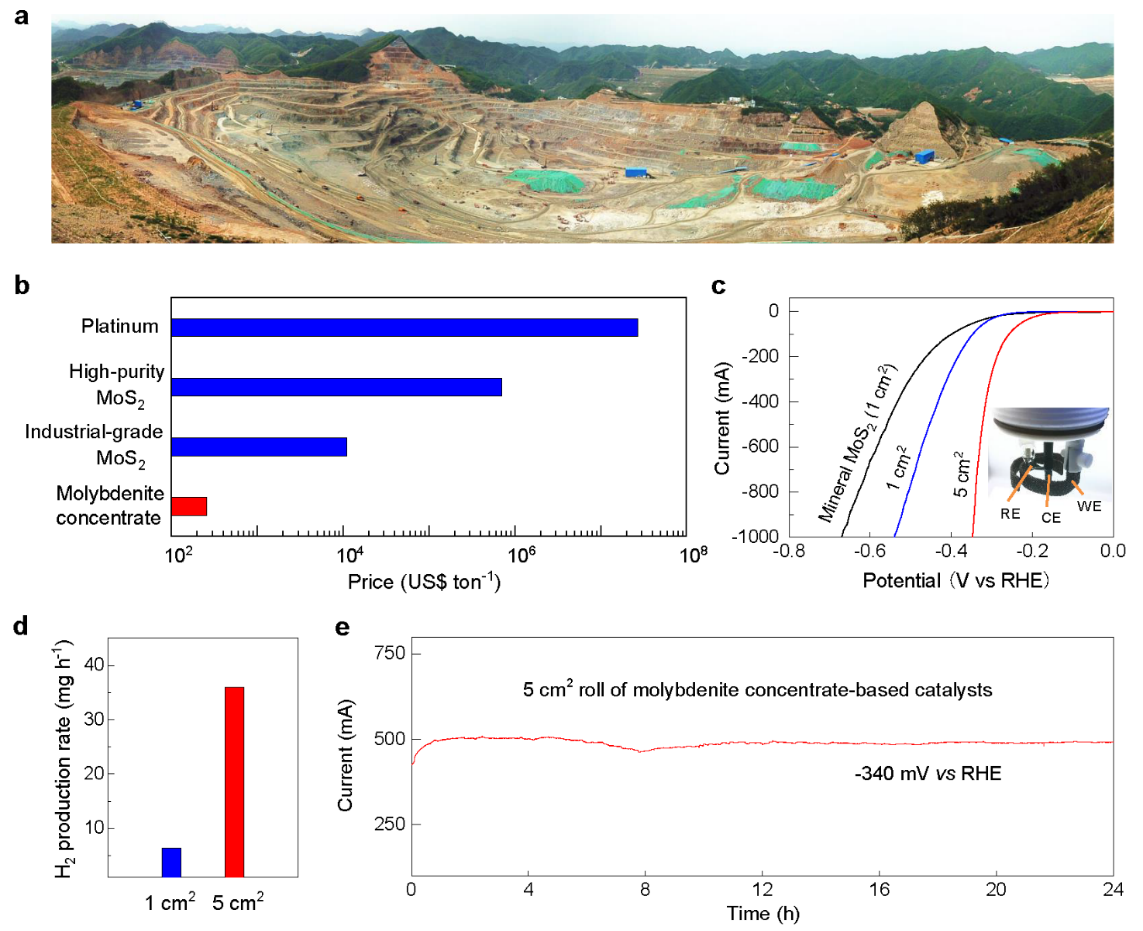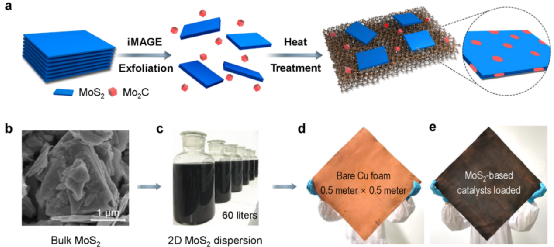 mk(中国)网7月29日电 7月24日,清华-伯克利深圳学院刘碧录、成会明团队在《自然·通讯》(NatureCommunications)期刊上在线发表了题为“大规模制备廉价矿物基二维材料大电流产氢电催化剂”(High-Throughput Production of Cheap Mineral-Based Two-Dimensional Electrocatalysts for High-Current-Density Hydrogen Evolution)的研究论文。该研究开发了一种大通量制备二维二硫化钼(MoS2)浆液电催化剂的方法,所制备的二维二硫化钼基电催化剂具有良好的电解水产氢活性,在1Acm-2的大电流密度下所需过电压仅为412mV,并呈现出良好的稳定性。同时,该方法可以拓展至以低成本矿物自然资源为原料来制备电催化剂,是目前已报道制备速率最快、成本最低的方法之一。该工作对二维材料的工业应用以及低成本大储量矿石等自然资源的高附加值应用开发具有较大指导意义。