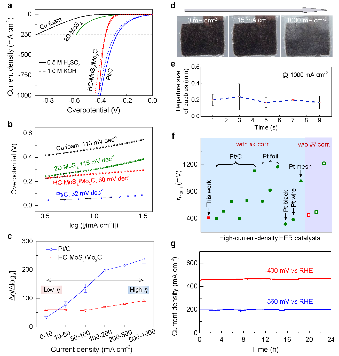当前,利用电解水方法制备氢气是可再生能源转化和可持续发展的有效策略之一。电解水制氢技术目前最大的问题是其高能耗与高成本。因此,开发和使用高效廉价电催化剂,是实现电解水产氢技术大规模工业应用的前提。铂基催化剂是公认最有效的电解水产氢催化剂,然而铂的低储量导致成本高昂,限制了其大规模工业使用。近年来,开发高效和廉价的大电流产氢电催化剂以及其规模制备方法,成为发展工业化电解水产氢技术的重要研究方向。基于研究团队前期对二维材料规模制备(National Science Review, 2020, 7, 324)及大电流密度电解水产氢催化剂设计(Nature Communications, 2019, 10, 269)的工作基础,本文进一步提出了大通量、可放大规模化制备二维材料大电流产氢电催化剂的方法。所制备的二硫化钼基电催化剂在驱动1000mAcm-2的电流密度时所需的过电压仅为412mV(0.5 M H2SO4的酸性体系中)与440mV(1.0 M KOH的碱性体系中)。