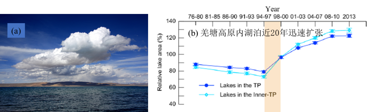 图1.自20世纪90年代中期以来羌塘高原内部湖泊急剧扩张。其中,图a为中科院青藏高原研究所类延斌博士提供,图b来自Zhang et al.(2017, GRL)。