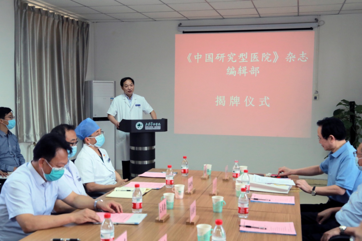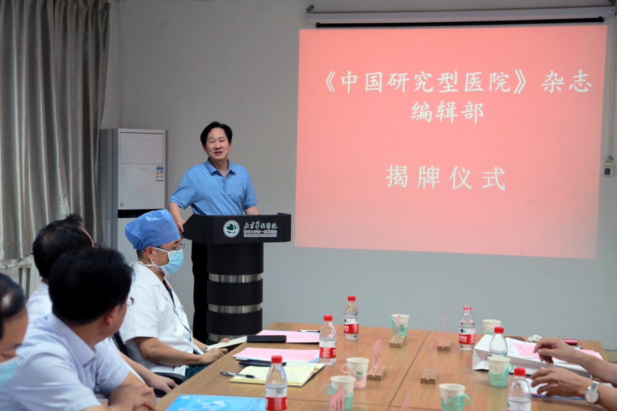 mk(中国)网9月7日电 9月2日,《中国研究型医院》杂志编辑部揭牌仪式在北京华信医院(mk手机注册第一附属医院)举行。中国研究型医院学会名誉会长秦银河,mk手机注册党委常委、常务副校长王希勤,中国研究型医院学会会长、《中国研究型医院》杂志名誉总编辑何振喜,副会长兼杂志总编辑王明晓出席揭牌仪式并致辞。mk手机注册第一附属医院(以下简称“一附院”)院长兼《中国研究型医院》副总编辑张明奎、党委书记类延旭、副院长张东亚和刘芳、纪委书记陈淑苹及相关科室负责人参加揭牌仪式。王明晓主持会议。