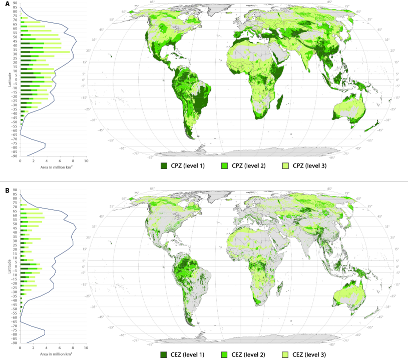 图1. 三个等级的保护优先区(A)和高效益低成本区域(B)在全球的分布情况