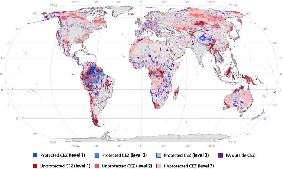 生物多样性下降导致严重的社会与生态危机。许多科学家和保护实践者呼吁在全球范围内扩展自然保护地,以应对这一危机。然而,目前尚不清楚应该在哪些地方设置新的自然保护地,才能以高效益、低成本的方式保护生物多样性。为回答这一问题,该研究开展了空间荟萃分析,叠加了七个全球生物多样性保护优先区方案,综合识别出“保护优先区”(Conservation Priority Zones, CPZs),进而与低人类影响区(Low Human Impact Areas, LIAs)叠加,识别出自然保护地认定的“高效益低成本区域”(Cost-Effective Zones,CEZs)。高效益低成本区域即为具有重要生物多样性保护价值,且同时适宜建立保护地的区域。研究发现,“高效益低成本区域”约占全球陆地面积的38%,但是全球有大面积的“高效益低成本区域”未受到保护——尽管全球已经有14.1%的陆地被认定为保护地,但只有24%的“高效益低成本区域”受到了保护,剩余的76%仍然位于保护地之外。为了填补这一空缺,我们不仅需要增加保护地的数量,更要在合适的地区提升保护的效益,从而整体提升保护地系统的质量。为了保护更多的 “高效益低成本区域”,研究提出三种保护情景——保守目标、中等目标和宏伟目标,分别需要保护全球陆地面积的19%,26%和43%。此外,研究为每个《生物多样性公约》缔约方制定了国家尺度的三种保护目标,并识别了具有明确空间边界的“高效益低成本区域”,为制定《2020年后全球生物多样性框架》提供了决策支持。