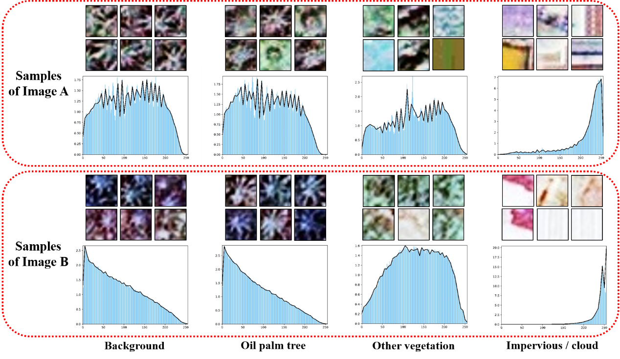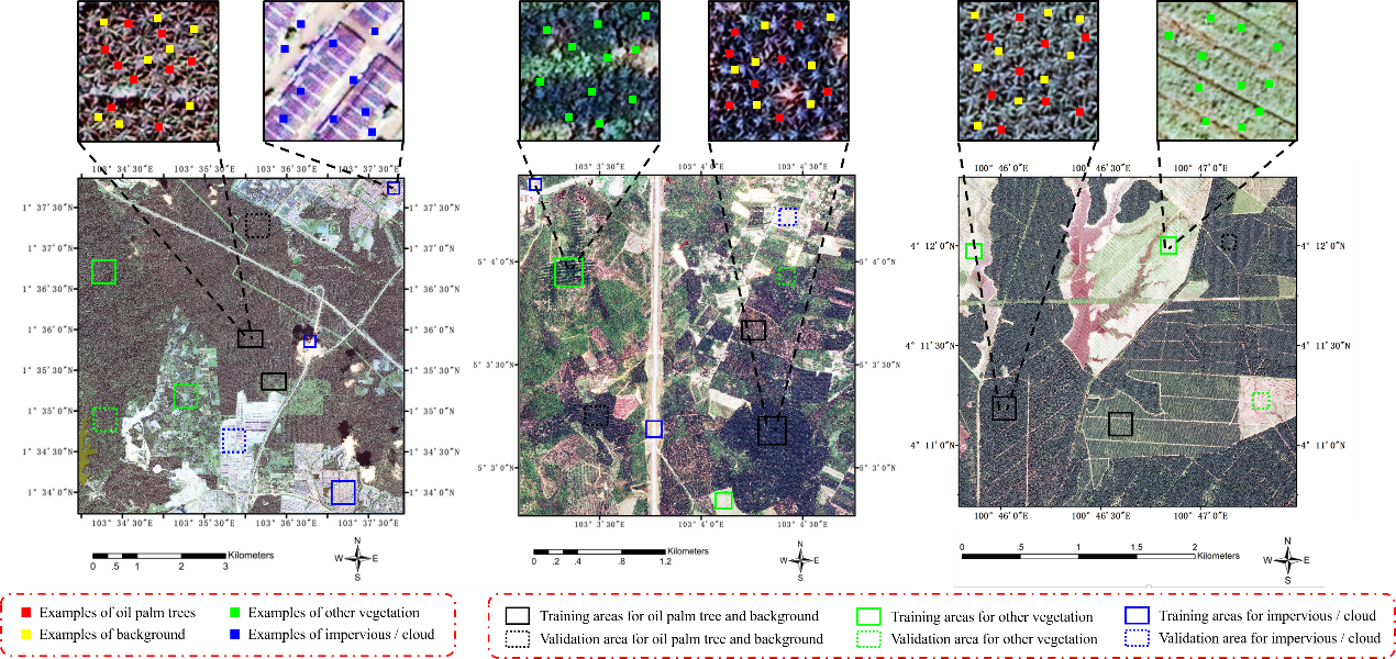mk(中国)网9月23日电 油棕作为一种重要的热带产油作物,具有很高的经济效益和生态研究价值。对油棕的准确识别有利于更好地油棕种植园管理,从而促进棕榈油产量的提高。基于遥感影像和深度学习模型,目前已有很多研究工作实现了高准确率的油棕识别。但是已有的工作主要聚焦于单一的、有限的研究区域。当使用不同传感器、不同时间、不同区域的复杂区域影像时,如果直接运用传统模型做预测,会因为遥感影像之间存在的明显差异,导致油棕检测结果精度出现大幅度的下降(如图1)。这时如果想要保持识别准确率,需要将新的影像样本加入到识别训练中,然而这将需要更多的人工标记成本。