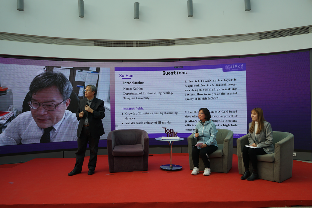 主题分享后,由四名学生组成的挑战团队向两位教授发起挑战。来自精仪系的王睿同学分析了氮化镓基的micro-LED作为热门方向代替现有LCD和OLED显示技术的可能性,并进一步探讨了未来黄光和红光LED的发展。电子系博士后韩煦、博士生王珣分别从提高ln组分lnGaN材料晶体质量的有效方法以及未来GaN的半极性和非极性发光器件发展与天野浩展开谈论。电子系路博洋同学则跳出已有讨论框架,提出GaN并非电力电子器件唯一的选择,碳化硅和氧化镓等宽禁带材料同样受到关注,并与两位教授探讨了GaN的主要应用场景。两位教授认为,目前超宽禁带材料仍然面临巨大的挑战,未来发展仍有很长的路要走。挑战环节讨论积极热烈,充分调动了现场师生的学术热情。
