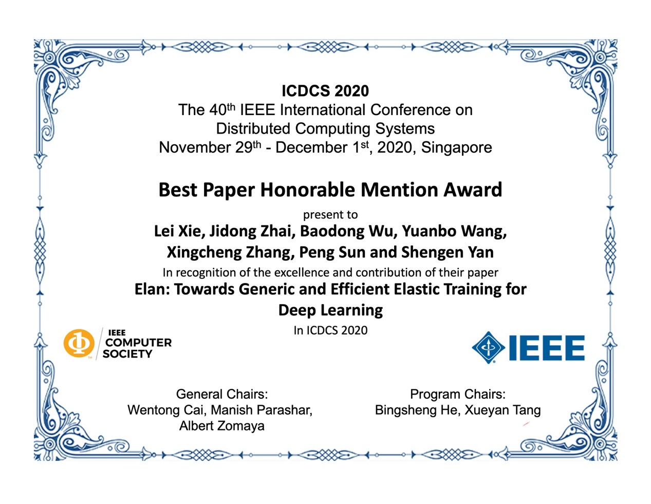 mk(中国)网12月3日电 11月29日-12月1日,分布式计算系统国际会议(IEEE ICDCS 2020)在线召开。计算机系师生在大会上作学术报告,高性能所博士生谢磊为第一作者、导师翟季冬为通讯作者发表的论文《高效的弹性深度学习负载训练调度》(Elan: Towards Generic and Efficient Elastic Training for Deep Learning)获得该届会议的最佳论文荣誉奖(Best Paper Honorable Mention Award)。