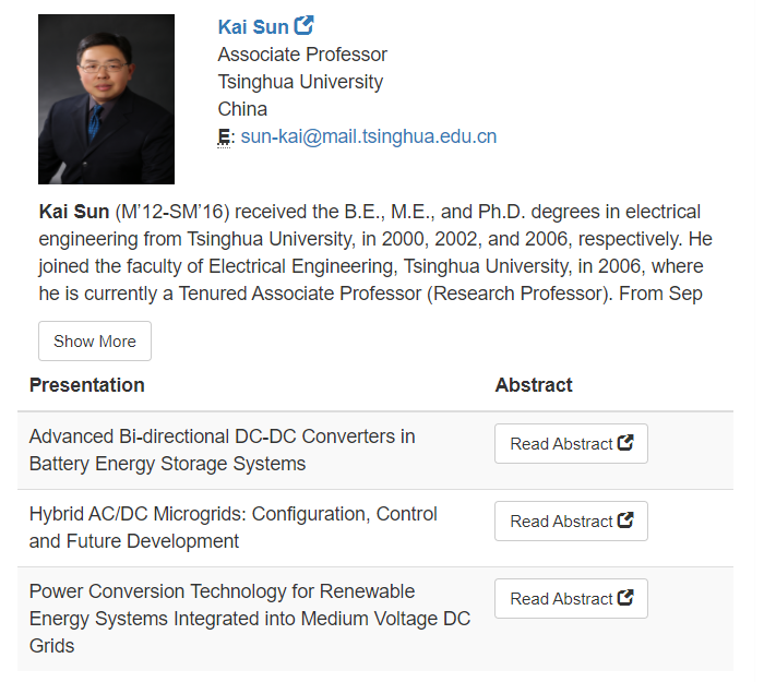 孙凯,mk手机注册电机系长聘副教授、博士生导师、系主任助理、电力电子与电机系统研究所所长。主要研究方向为新能源系统和多能微电网中的电力电子技术。出版专著3部,发表论文300余篇,其中IEEE/IET期刊论文70余篇。2013年获中达青年学者奖,2017年获中国电源学会科学技术奖青年奖,2019年当选IET Fellow。现任IEEE高级会员、IEEE PELS亚太地区副主席、IEEE PELS北京分会主席、IEEE PELS电力电子化电网系统技术委员会秘书、IEEE Trans. Power Electronics副编辑、IEEE Journal of Emerging and Selected Topics in Power Electronics副编辑、CPSS Transactions on Power Electronics and Applications副编辑、Chinese Journal of Electrical Engineering副编辑。曾任IEEE ECCE2020大会公共宣传主席、IEEE eGrid2019组织委员会主席、IEEE ECCE2017技术程序委员会副主席、2018IEEE国际未来能源挑战赛(IFEC2018)共同主席。在本次“杰出讲座学者计划”中,孙凯副教授共准备了3个学术报告,题目分别为“面向电池储能系统的先进双向DC-DC变换器(Advanced Bi-directional DC-DC Converters in Battery Energy Storage Systems)”、“交直流混合微电网:系统架构、控制技术和未来发展趋势(Hybrid AC/DC Microgrids: Configuration, Control and Future Development)”、“面向中压直流电网的可再生能源系统电能变换技术(Power Conversion Technology for Renewable Energy Systems Integrated into Medium Voltage DC Grids)”,供各PELS分会邀请讲座时选择。