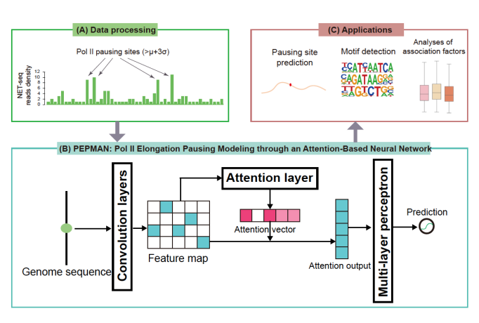 真核生物的转录是一个高度复杂且被准确调控的动态过程,RNA聚合酶II(RNA polymerase II, Pol II)作为转录过程(特别是转录延伸阶段)的核心分子成员,对遗传信息的传递起着关键作用。研究表明,在转录延伸过程中,普遍存在Pol II暂停(Pol II pausing)现象,其参与下游基因的表达调控、影响基因可变剪切的发生,与细胞分化、发育等生命活动息息相关。目前,Pol II暂停相关的转录调控机制研究主要依赖于NET-seq(Native elongating transcript sequencing)等高通量测序技术,成本高、需要一定实验周期。因此,如何实现在全基因组水平上快速、高效的分析Pol II暂停的偏好位点及其序列特征,以及其与相关转录因子间的关系,是转录调控领域亟待解决的技术难点。为了解决这一问题,来自mk手机注册的曾坚阳、赵诞团队采用基于注意力机制(attention mechanism)的卷积神经网络对全基因组上的Pol II暂停位点进行预测。在NET-seq数据集上,其预测准确率均显著优于现有机器学习模型。此外,研究组通过分析模型的注意力机制以及分析模型在基因组上特定位点的预测值,进一步探索了Pol II暂停的生物学特征以及和其他转录调控机制的关系,包括:发现了决定Pol II暂停的序列特征以及其与暂停位点的关系;通过分析不同可变剪切方式位点上Pol II的暂停倾向,提供了Pol II影响可变剪切的可能生物学机制;全面分析了Pol II与转录因子、组蛋白修饰、DNA甲基化发生的相关性;发现模型能够很好的弥补测序数据深度不足带来的缺陷。
