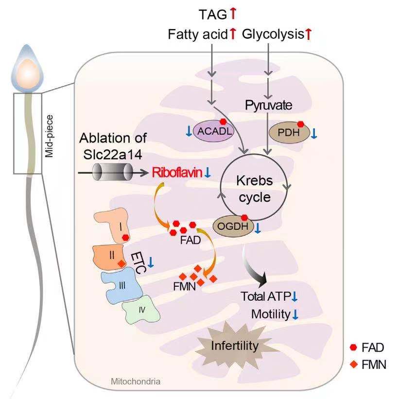 以上研究成果于2021年4月20日在《细胞通讯》(Cell Reports)期刊在线发表,研究论文题目为《SLC22A14:精子氧化磷酸化与男性生育所需的线粒体核黄素转运体》(SLC22A14 is a mitochondrial riboflavin transporter required for sperm oxidative phosphorylation and male fertility)。