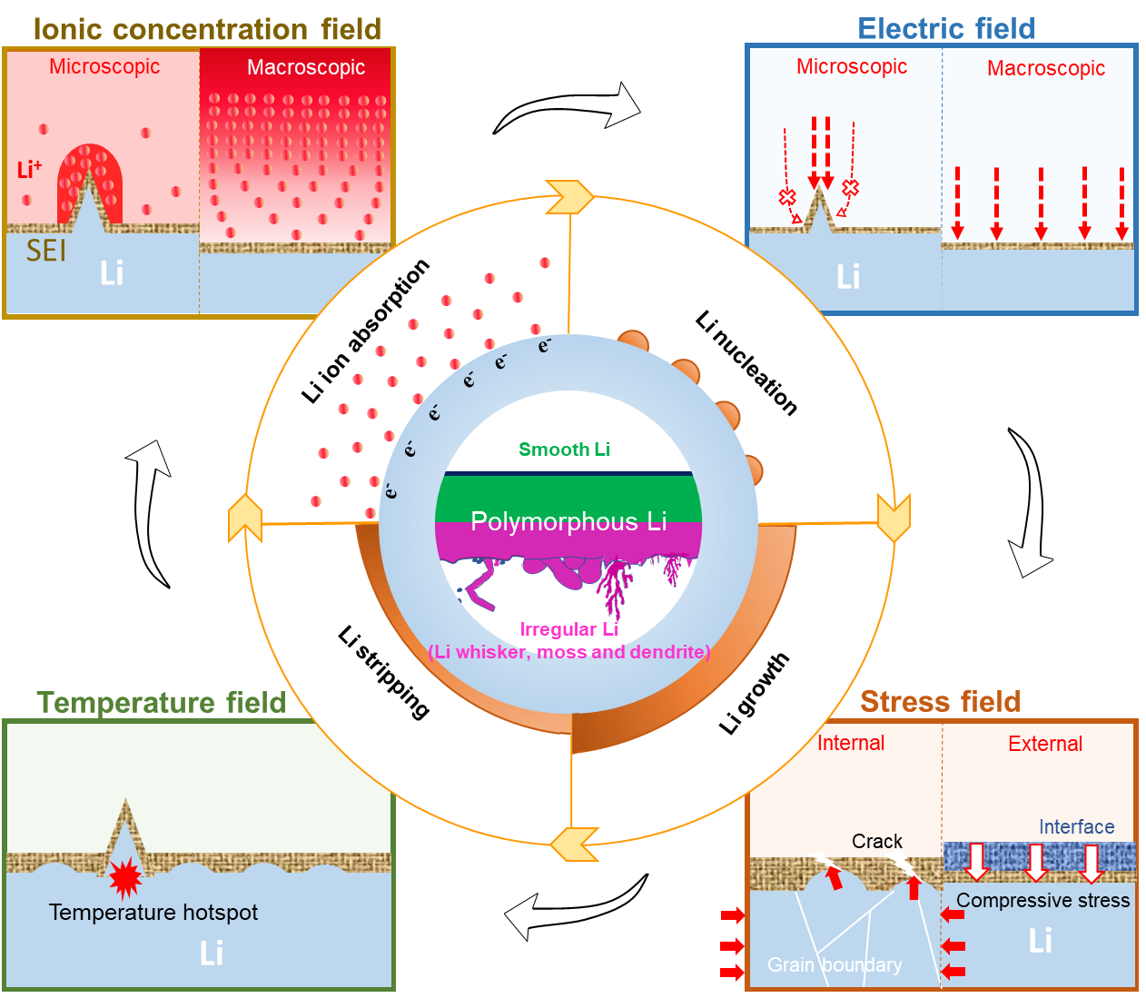 总结在电化学循环过程中,多物理场(离子浓度场,电场,应力场和温度场)与多形态锂金属演变之间的联系