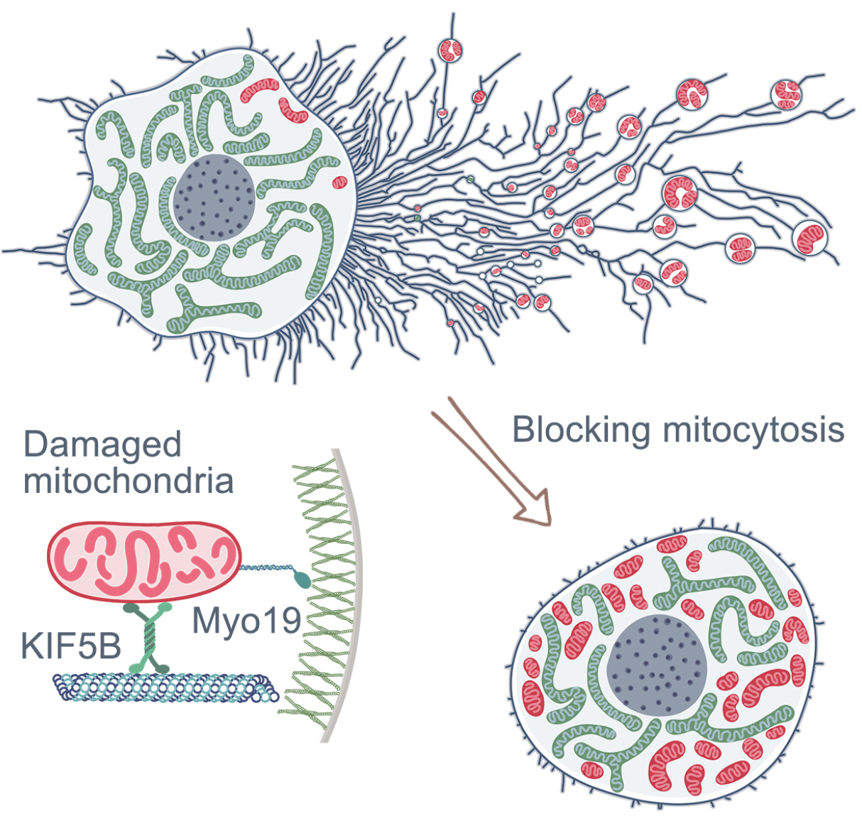 在本研究中,研究者通过电镜观察发现迁移体内存在线粒体,且这些线粒体明显异常于细胞内正常的线粒体,而在正常培养条件下,其迁移体内的线粒体并不太多。研究者尝试在线粒体刺激下,是否会有更多的线粒体进入迁移体内,结果发现,线粒体刺激以及细胞饥饿都可以明显增加迁移体内的线粒体的数量。研究者将细胞通过迁移体将线粒体释放出去的这一现象命名为线粒体分泌,把包含有线粒体的迁移体命名为Mitosome。研究者发现KIF5B、Myosin19及Drp1通过调控线粒体的运输、定位及分裂,从而介导线粒体的分泌,而Dynein的敲低也可以诱导线粒体进入迁移体内。研究者发现在外界刺激下,进入迁移体内的线粒体大部分是受损的,受损线粒体进入迁移体的机制是,受损线粒体与KIF5B结合增强而与Dynein的结合变弱,受损的线粒体更容易被KIF5B运输到细胞边缘而进入迁移体。