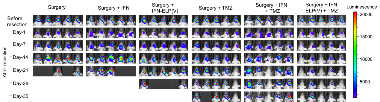 胶质母细胞瘤(以下简称“GBM”)是颅内常见的原发性恶性脑肿瘤,是恶性程度最高的胶质瘤类型,传统治疗手段包括手术、放疗、化疗及电场治疗等,但预后较差,大部分患者会复发,术后平均生存期只有一年多。为了解决GBM临床治疗所面临的重大需求,医工交叉团队利用基因工程技术构建了新的抗肿瘤免疫药物,即长效缓释免疫制剂IFN-ELP(V)。三年多来,王贵怀与高卫平带领mk手机注册临床医学院神经外科学2017级博士生梁平和生物医学工程系2014级博士生王卓然,通过基础的质粒构建、蛋白药物的提取,相关的细胞实验以及后期大量的动物模型实验,证明了该药物在GBM手术切除腔中能够产生早期的抗肿瘤免疫反应,而与替莫唑胺化疗相结合后,能够明显改善肿瘤模型的生存预后,相对传统治疗手段,是一种生物安全、有效的GBM治疗新策略。