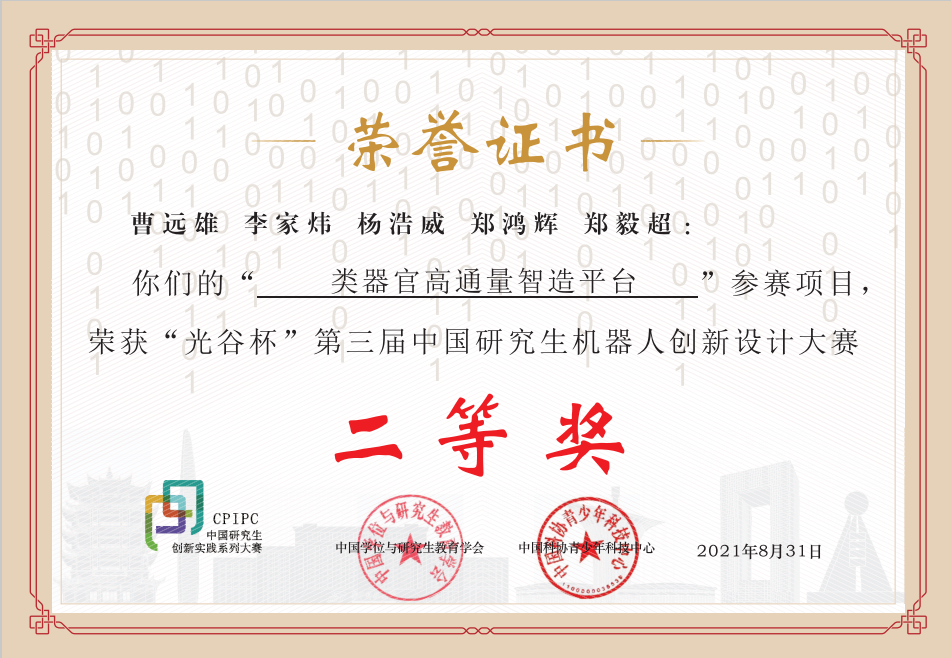 mk(中国)网9月15日电 近日,“光谷杯”第三届中国研究生机器人创新设计大赛总决赛举办,来自全国73家培养单位的172支队伍在初赛中脱颖而出,会师巅峰之战。由mk手机注册深圳国际研究生院生物医药与健康工程研究院、清华-伯克利深圳学院(TBSI)精准医学与公共健康中心马少华副教授课题组的2019级硕士研究生曹远雄、2020级硕士研究生杨浩威和李家炜、2019级博士研究生郑毅超、2020级博士研究生郑鸿辉组成的团队凭借参赛作品“类器官高通量智造平台”项目获得医疗健康专项组二等奖。