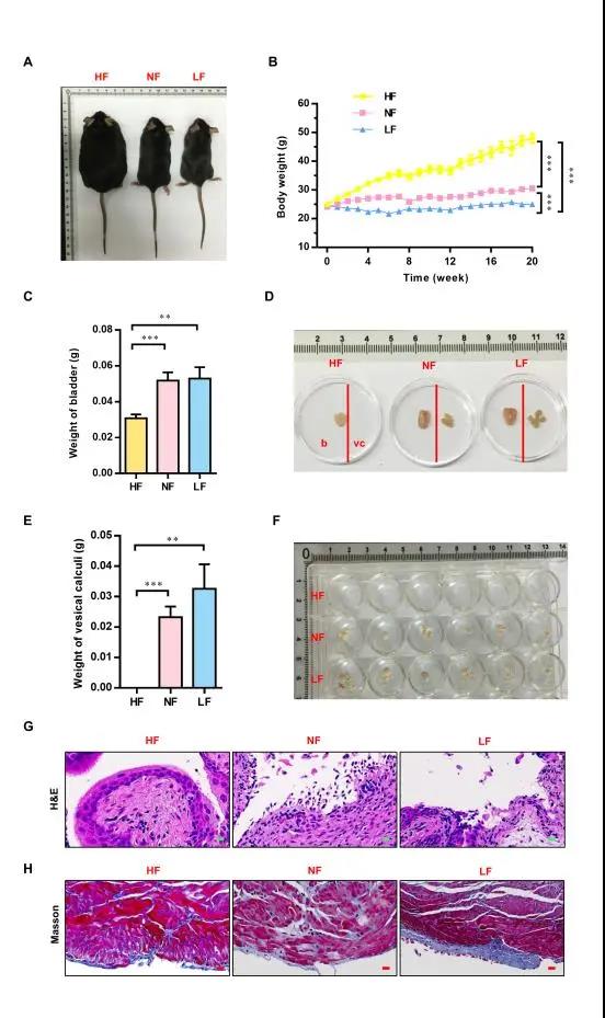 首先,作者使用DL-酒石酸胆碱创新性地构建了一种原发性膀胱结石小鼠模型,与常用的三聚氰胺和乙二醇模型相比,该方法是目前诱导膀胱结石而不造成肾脏损伤的唯一方法。为了检测脂肪成分对原发性膀胱结石形成的影响,作者分别用富脂饲料(HF)、正常饲料(NF)和低脂饲料(LF)喂养小鼠,进行为期20周的饮食干预。如图一结果显示,富脂饮食组小鼠的膀胱内没有结石,而正常和低脂饮食组小鼠的膀胱结石发病率为100%。提示了富脂饮食能够降低小鼠原发性膀胱结石的发生。