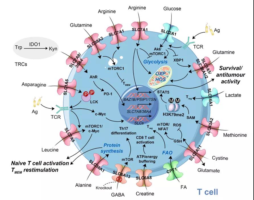 肿瘤微环境中的免疫细胞不仅受到缺氧和酸化环境等的影响,通常还由于营养不足导致功能受损。因此,SLCs及其转运的底物(葡萄糖、氨基酸、脂质等)对于免疫细胞的存活和功能至关重要。T细胞表达葡萄糖相关转运蛋白(SLC2A1、SLC16A1/4),氨基酸相关转运蛋白(SLC7A5、SLC38A1、SLC43A2、SLC7A1等),脂质相关转运蛋白(FABP5、CPT1A等)以及一些其它类型的转运蛋白(SLC7A8、SLC36A4、SLC6A8和SLC6A13)并通过多种机制来影响其激活和功能(图1)。其中,糖类相关的SLCs主要涉及糖酵解、Akt/mTORC1信号通路、染色质乙酰化和IFN-γ生成等;氨基酸相关的SLCs主要包括mTORC1/c-Myc、TCR信号、糖酵解、氧化磷酸化、谷氨酰胺分解等;脂类相关的SLCs主要有TCR/CD28-mTORC1信号轴、脂肪酸氧化、PPARβ/γ信号通路等;以及与IDO1活性、AhR和PD-1表达、GABA-mTOR信号通路等相关的一些其它类型的转运蛋白。这些SLCs及其底物通过相似或不同的调控机制介导了T细胞不同亚型的激活和分化。因此,这就为我们利用SLCs来操控T细胞的功能和分化,从而提高肿瘤免疫治疗提供了可能。
