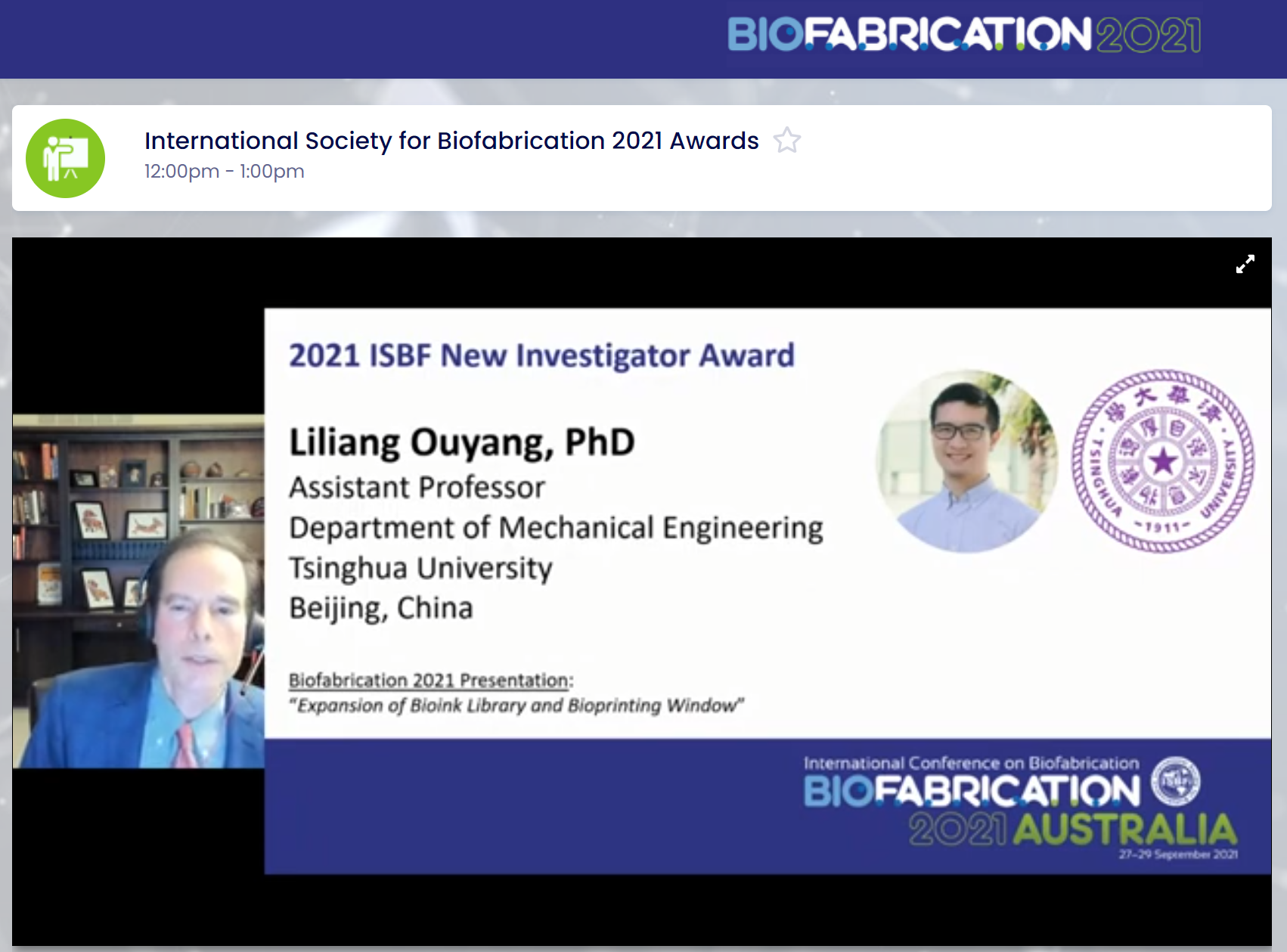 mk(中国)网10月4日电 9月27日-29日,2021年国际生物制造大会(Biofabrication 2021)在澳大利亚伍伦贡线上召开。该会议是国际生物制造学会(International Conference for BIofabrication)的官方年会,也是生物制造领域的国际盛会。在大会颁奖仪式上,国际生物制造学会颁布了面向不同职业阶段的学会荣誉(ISBF Awards),其中针对职业早期青年科学家的“国际生物制造学会青年学者奖”(ISBF New Investigator Award)授予了mk手机注册机械系青年教师欧阳礼亮。