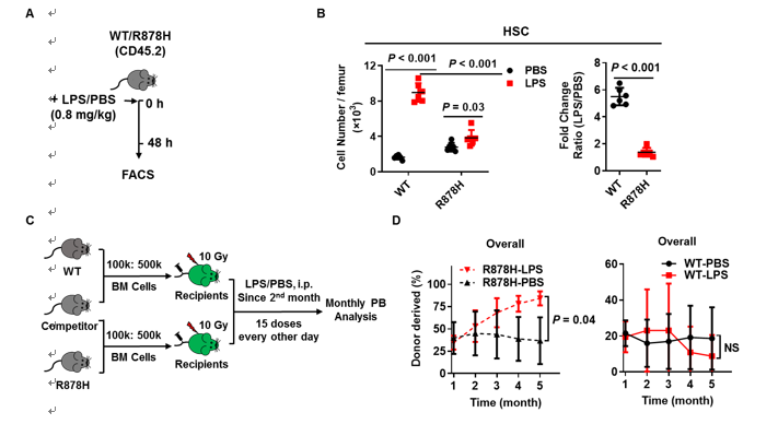 图3 LPS诱导的慢性炎症促进R878H驱动的克隆性造血