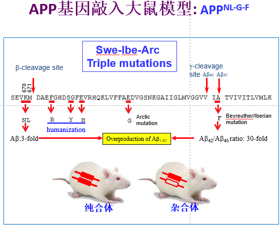 大脑中淀粉样蛋白的沉淀(Aβ)被认为是AD病人的主要病理表现和主要病因。而Aβ的前体App基因的一些突变,会大大加速Aβ沉淀。因此,以往绝大多数的AD模型,采用各种各样的转基因技术,将不同突变型的App基因表达在小鼠中。而转基因技术有一系列不可避免的的缺陷:将人类App突变基因随机插入小鼠的染色体中,可能破坏插入处小鼠自身正常基因的表达;导致基因表达在错误的脑区,错误的细胞,或者错误的时间等;最大的缺陷是导致App的过量表达并被酶切成Aβ和一些非生理的蛋白片段,它们会扰乱小鼠的正常生理功能,导致了与AD无关的表型。