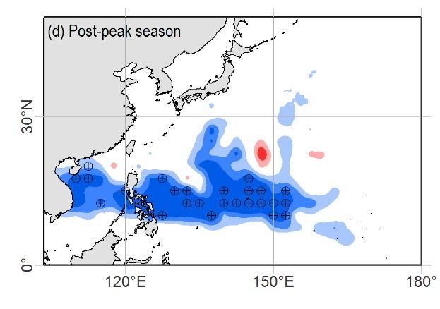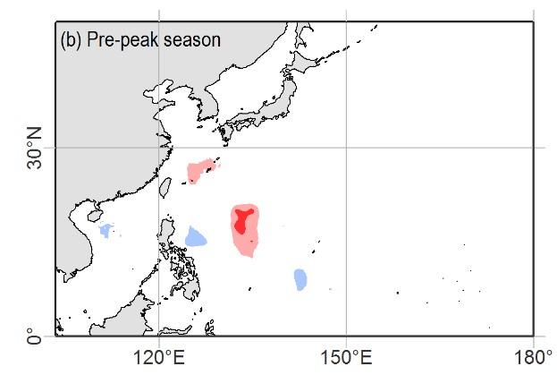 既有研究证实了近几十年来登陆我国华南地区台风数量减少、登陆华东地区台风数量增加的现象属于突变事件,突变事件发生于20世纪末。那么,能否将其简单理解为台风登陆位置由华南地区向北偏移至华东地区呢?答案并非如此。mk手机注册近岸海洋动力学研究团队研究首先指出,登陆华南地区台风数量减少和登陆华东地区台风数量增加是两个独立的现象。其中,登陆华南地区的台风数量减少是由于西行台风在10-12月显著减少,这一现象与西北太平洋台风生成数量减少有关;登陆华东地区的台风数量增加是由于西北行台风在7-9月显著增加,这一现象与西北太平洋台风生成位置向西偏移有关。