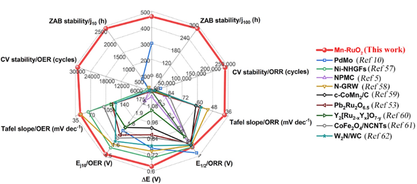 图2. Mn-RuO2催化剂与其他催化剂的ORR、OER及锌空气电池性能综合对比